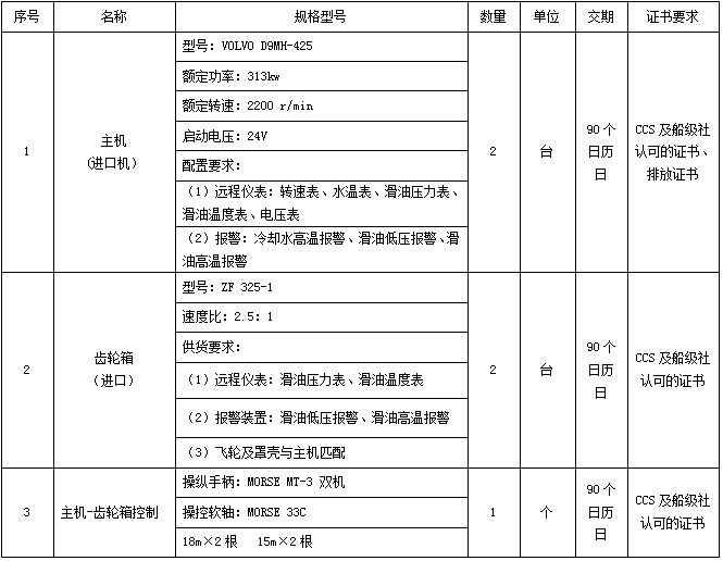 本項(xiàng)目適用于重慶帝力游艇制造有限公司:南部縣地方海事處33米應(yīng)急救援艇機(jī)電設(shè)備采購(gòu)機(jī)械設(shè)備采購(gòu)部分,該項(xiàng)已具備招標(biāo)條件,先對(duì)該項(xiàng)目進(jìn)行單一來源采購(gòu)招標(biāo)。