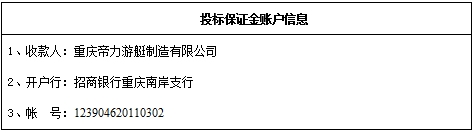 5、本次采購根據(jù)《重慶帝力游艇制造有限公司招投標(biāo)管理辦法》采用單一采購方式進(jìn)行開標(biāo)、唱標(biāo)、評(píng)標(biāo)、談判、定標(biāo)。