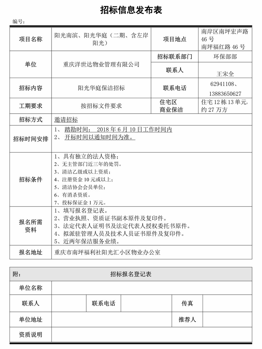 陽光華庭、陽光南濱保潔招標(biāo)
