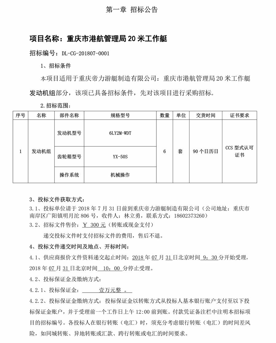 重慶市港航管理局20米工作艇發(fā)動機組招標(biāo)公告