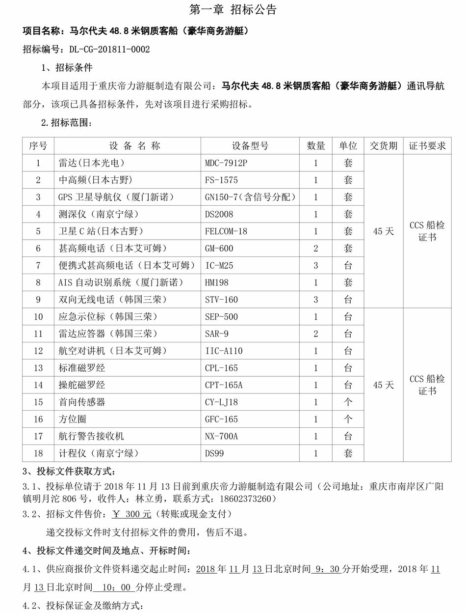 馬爾代夫48.8米鋼質(zhì)客船(豪華商務游艇)通訊導航部分招標公告