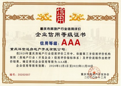 重慶洋世達(dá)房地產(chǎn)開發(fā)有限公司榮獲“重慶市房地產(chǎn)開發(fā)協(xié)會(huì)2020年度優(yōu)秀會(huì)員單位”稱號(hào)和重慶市房地產(chǎn)行業(yè)信用評(píng)價(jià)信用等級(jí)AAA級(jí)證書。