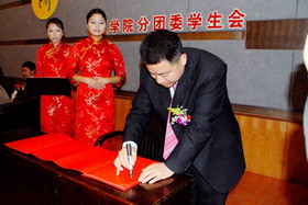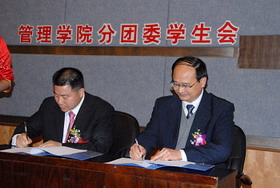管理學(xué)院領(lǐng)導(dǎo)為董事長楊勇頒發(fā)了“重慶工商大學(xué)管理學(xué)院大學(xué)生創(chuàng)業(yè)導(dǎo)師”聘書。董事長楊勇與管理學(xué)院簽署了“創(chuàng)業(yè)實習(xí)共建基地協(xié)議書”,并為本次論壇題寫了“超越夢想,成就自我”的題詞。