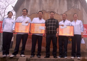 上午9時,大家來到江南體育館,整裝待發(fā),躍躍欲試。9點30分,隨著集團(tuán)公司領(lǐng)導(dǎo)張副總一聲令下,參賽隊員齊向山頂奔去。半個小時左右,第一名參賽隊員成功登頂,書寫了南岸區(qū)民間登山成績的新記錄。全體參賽隊員充分發(fā)揚(yáng)團(tuán)隊精神,互相鼓勵,互相幫助,于10點30分全部攀上山頂。隨后,大家在文峰塔旁舉行了熱烈的頒獎儀式,物管公司代表隊、驕陽綠陽聯(lián)合代表隊、凱誼公司代表隊分別獲得一、二、三名。