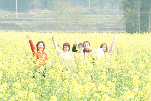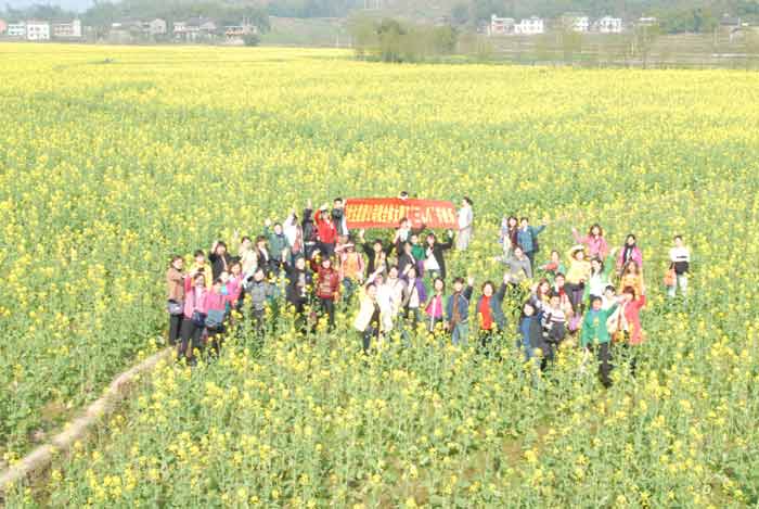 一大早,女同胞們就穿上了艷麗的春裝,迎著明媚的春光,前往墊江。在汽車行駛了一個半小時后,一大片金燦燦的油菜花便呈現(xiàn)在大家面前。望著一望無際的油菜花,自腳下,順著山谷,延伸至天邊。為如此壯觀的花景,使大家深感震驚。